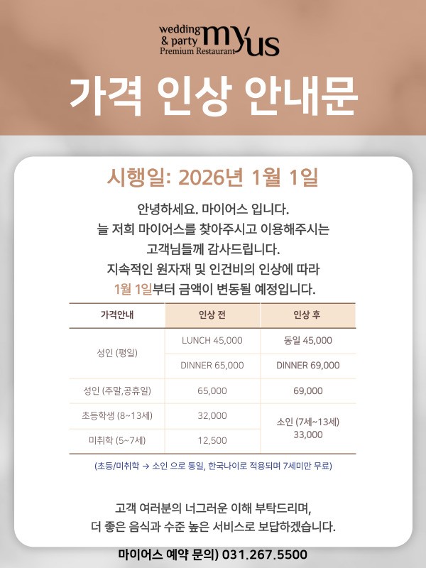 [26년 1월 1일 부터] 가격 인상 안내문 마이어스 웨딩&파티 2025.03.14 911 부득이하게 원재료비 및 인건비의 지속적인 상승으로 인해 26년1월1일부터 가격 인상을 하게 되었습니다.고객 여러분의 이해를 부탁드리며, 앞으로도 더 좋은 음식과 수준 높은 서비스로 보답하는 마이어스가 되겠습니다. 목록 이전글 2026 마이어스 금요일(런치/디너) 뷔페 할인 다음글 마이어스 연회장 새단장 리뉴얼 오픈