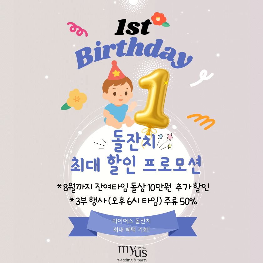 마이어스에서 돌잔치 최대 할인 프로모션을 진행합니다.